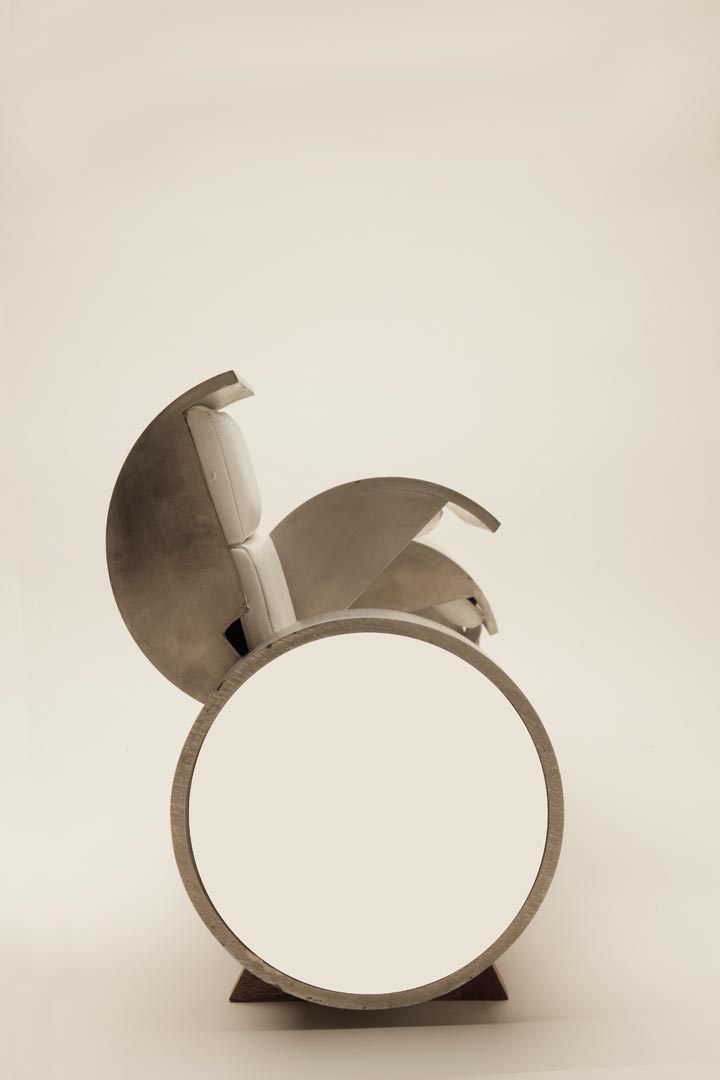 The first prototype of the Cloche Sofa consisted of a New York sewage pipe transformed into an urban sculpture of a fully-functional modular sofa. It was made in Copper with Gold Velvet seats, Plexiglas on the sides of the tube illuminated by an LED light. The tube shape was accented by LED side panels and conic base. The second creation of the Cloche sofa was life-sized and made out of Walnut in a sofa and armchair configuration. This was followed by a stainless steel prototype, birch prototype and white lacquered finish prototype of an oversized sofa and armchair. The concrete and PVC pipes are currently in progress.